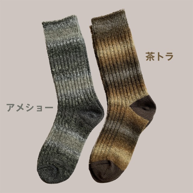惜しまれつつ閉店した靴屋ガーリィラウンジさんとのコラボレーションくつした。 ヘンゼルのように賢くぐんぐんと歩いていくイメージのくつしたです。 幅の広いボーダーがマニッシュな雰囲気。 通常の2倍の糸を使用し、特殊な編みたてのため、伸縮がとても良く、引っ張ると膝上まで伸びるハイソックスです。 スルッと滑らかに履けます。くつしたで靴がキツくなることがないように作りました。 踵を入れた後、あまり引っ張らずに引き上げ、膝下で留めると下がりにくいです。